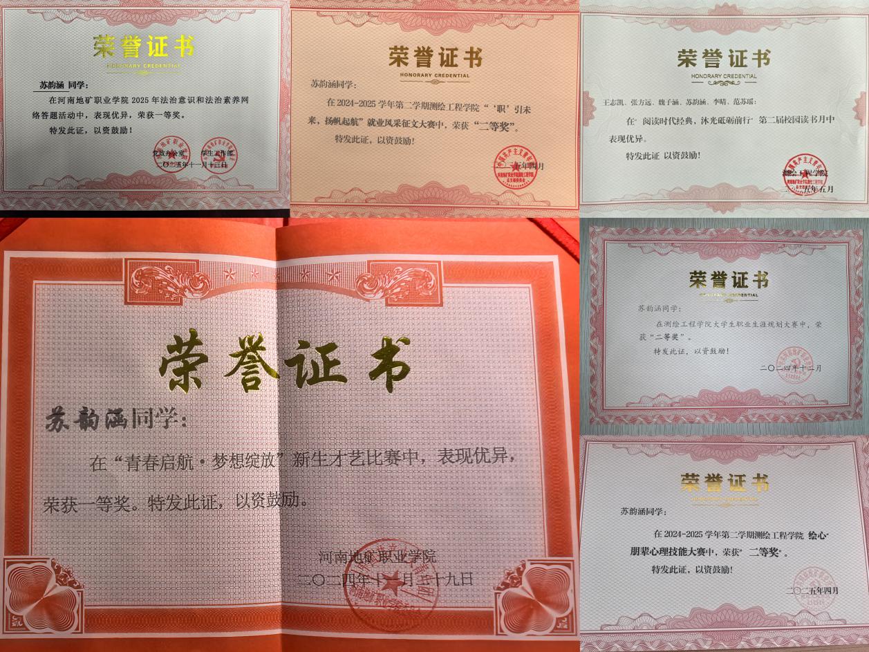 苏韵涵同学始终秉持严谨务实的求学态度,课堂专注听讲,课后深耕钻研,积极拓展学科视野。通过持之以恒的努力,她在大一学年取得专业排名第二的优异成绩,生动践行了“天道酬勤”的朴素真理。凭借扎实的专业基础与不懈的探索精神,她在多项学科竞赛中屡获佳绩:荣获2025年河南省大学生测绘学科创新创业智能大赛二等奖、2025年全国大学生数学建模竞赛河南赛区三等奖;在校内活动中亦表现突出,先后获得“青春启航·梦想绽放”新生才艺表演一等奖、2025年法治教育网络答题活动决赛一等奖等荣誉。每一张证书、每一次突破,都见证着她对卓越的追求与在学术道路上的坚定执着。